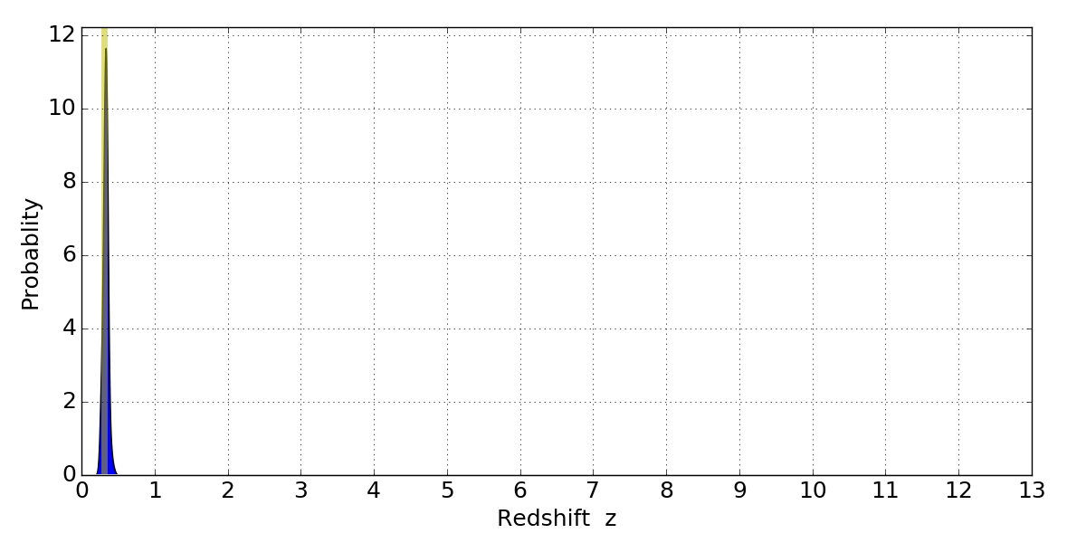 In P(z) plots: Yellow lines mark the cluster redshift z = 0.307,