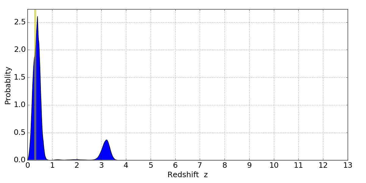 In P(z) plots: Yellow lines mark the cluster redshift z = 0.307,