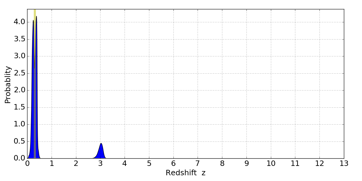 In P(z) plots: Yellow lines mark the cluster redshift z = 0.307,