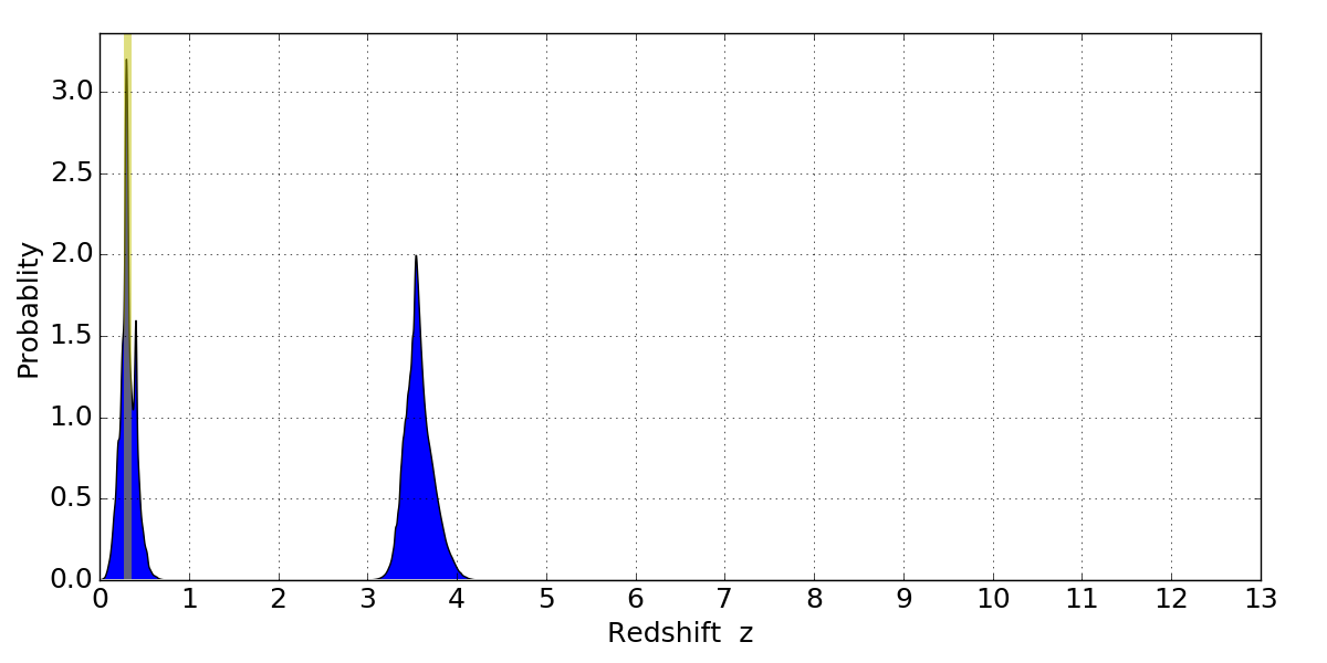 In P(z) plots: Yellow lines mark the cluster redshift z = 0.307,