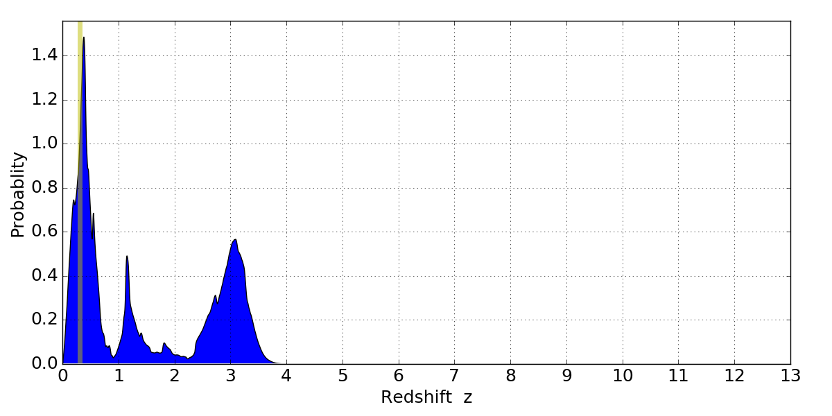 In P(z) plots: Yellow lines mark the cluster redshift z = 0.307,