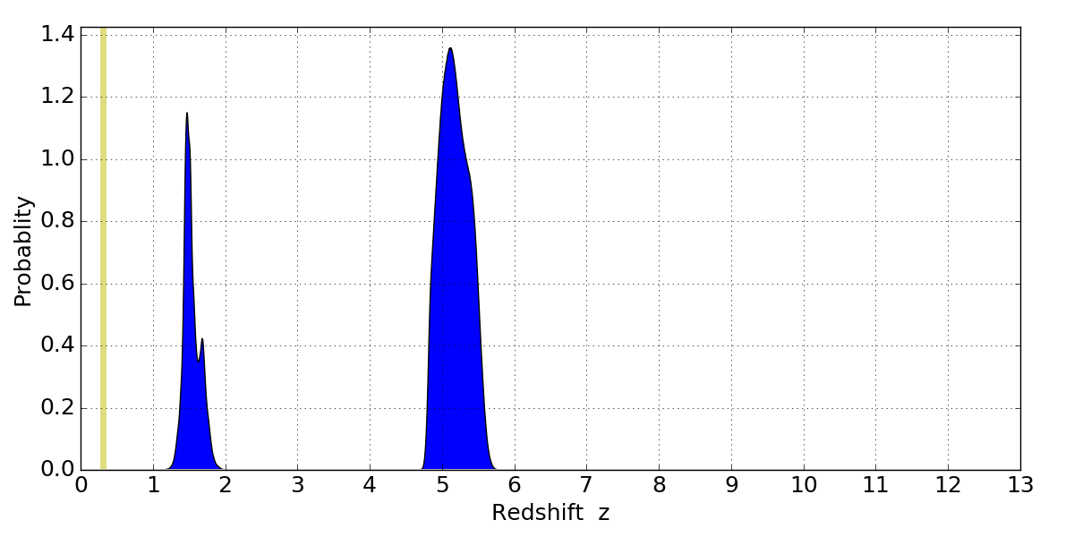 In P(z) plots: Yellow lines mark the cluster redshift z = 0.307,