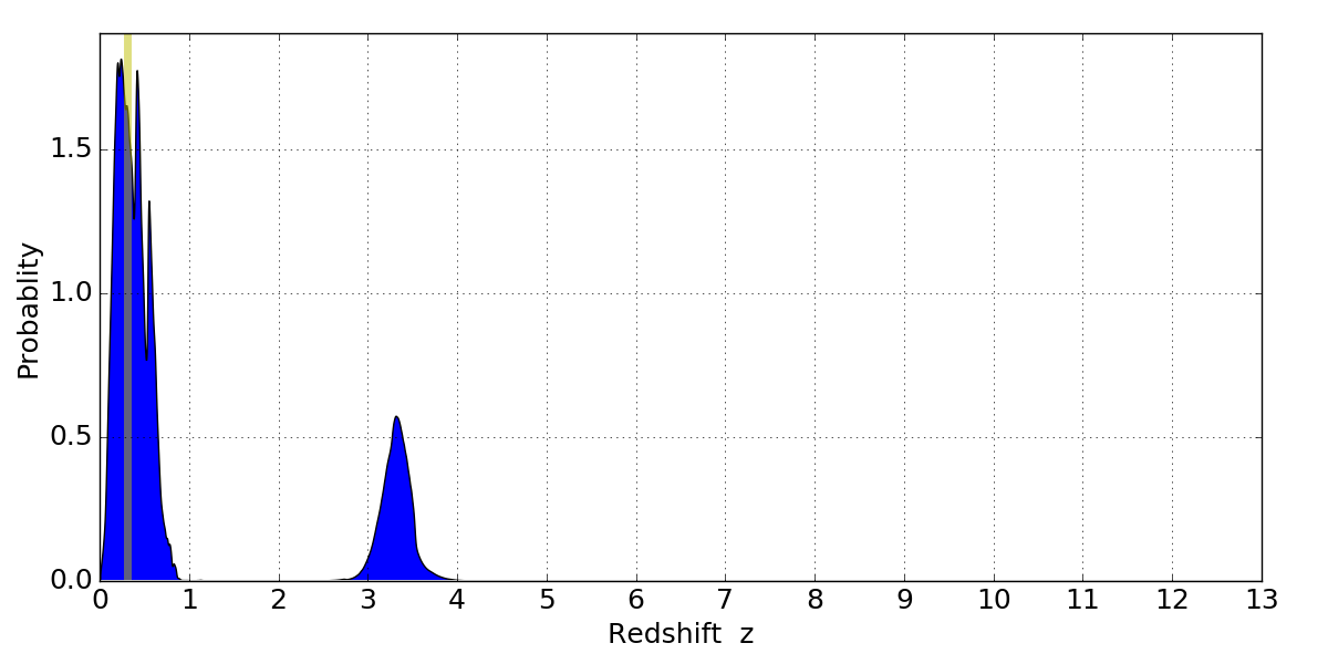 In P(z) plots: Yellow lines mark the cluster redshift z = 0.307,