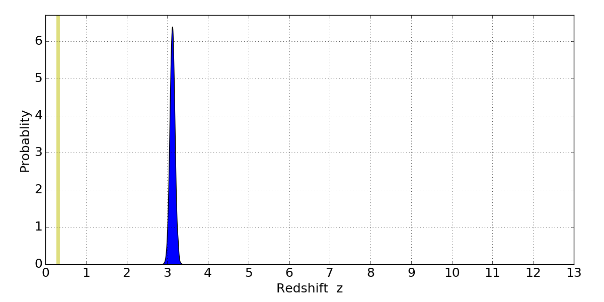 In P(z) plots: Yellow lines mark the cluster redshift z = 0.307,
