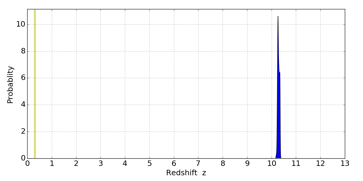 In P(z) plots: Yellow lines mark the cluster redshift z = 0.307,