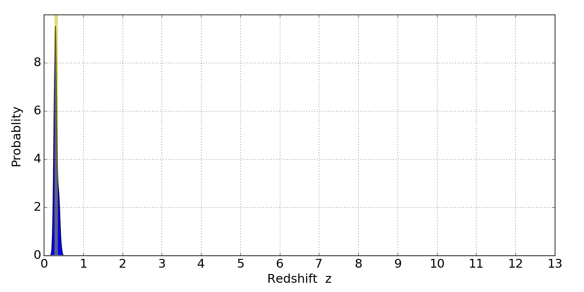 In P(z) plots: Yellow lines mark the cluster redshift z = 0.307,