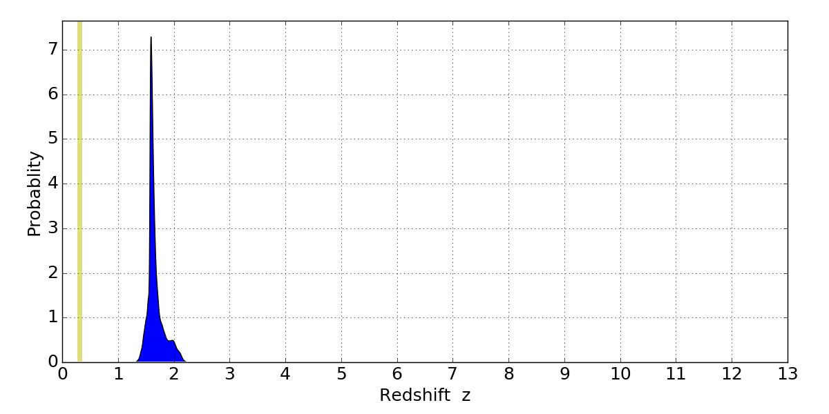 In P(z) plots: Yellow lines mark the cluster redshift z = 0.307,