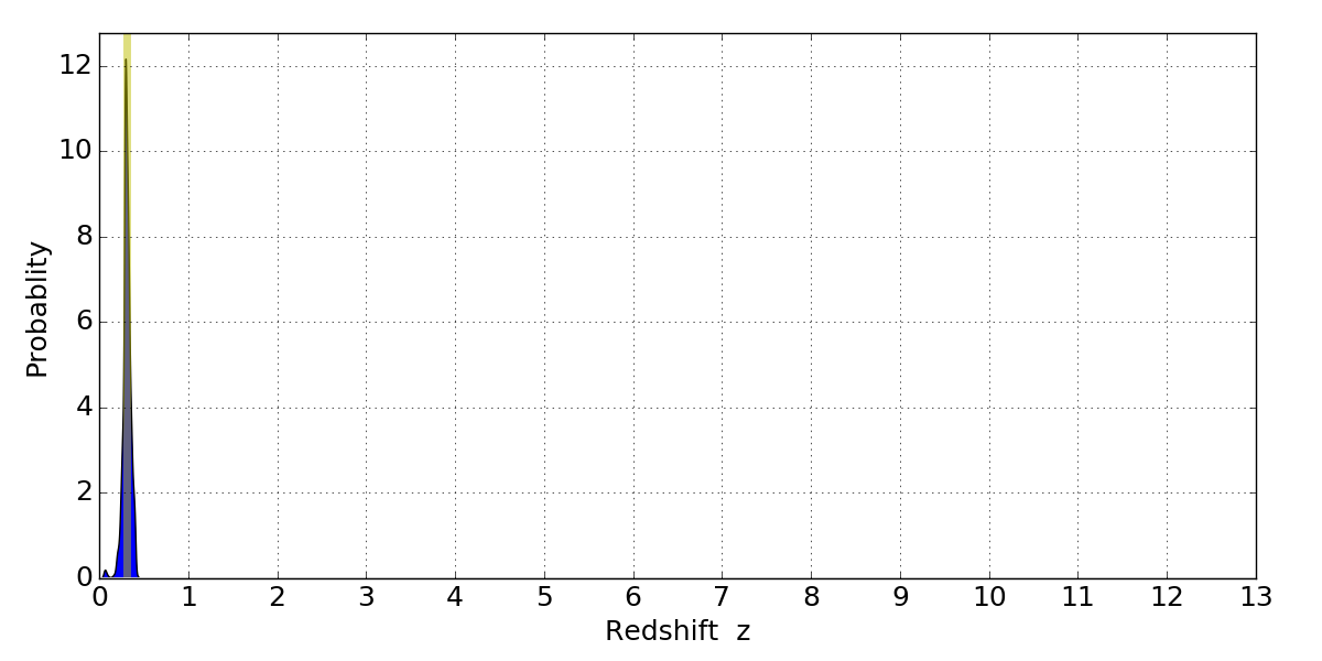 In P(z) plots: Yellow lines mark the cluster redshift z = 0.307,