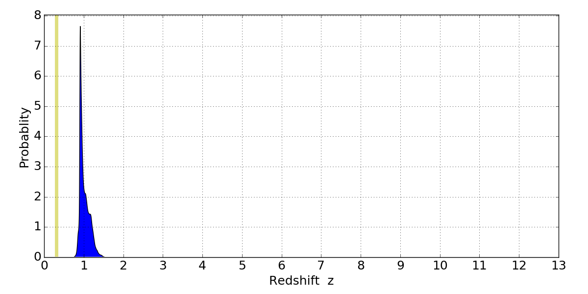 In P(z) plots: Yellow lines mark the cluster redshift z = 0.307,
