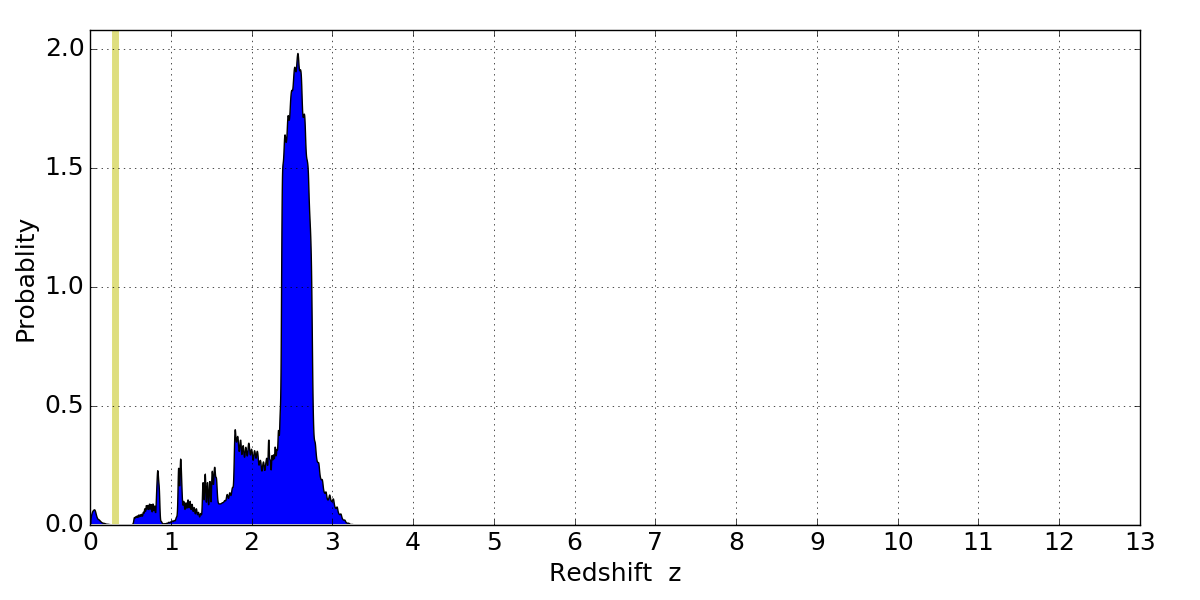In P(z) plots: Yellow lines mark the cluster redshift z = 0.307,