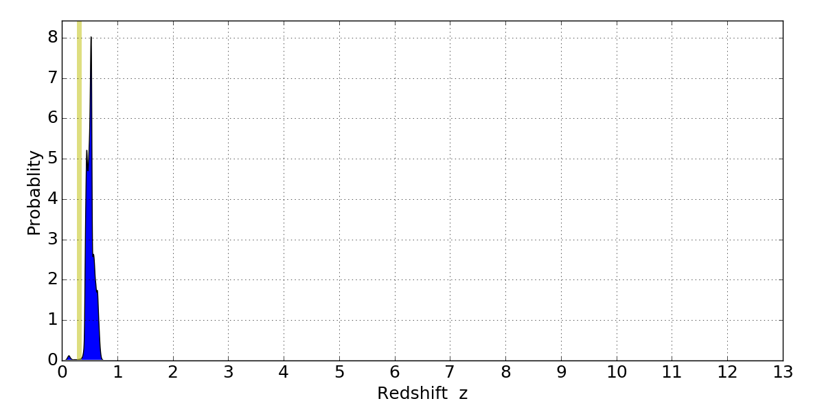 In P(z) plots: Yellow lines mark the cluster redshift z = 0.307,