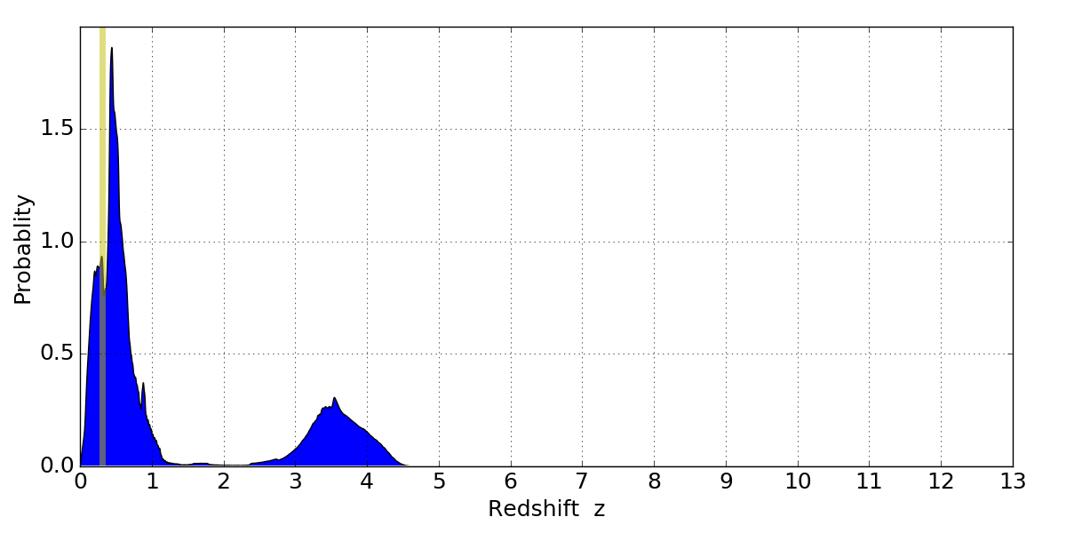 In P(z) plots: Yellow lines mark the cluster redshift z = 0.307,