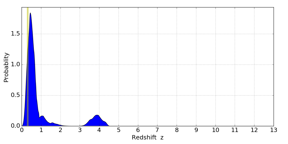 In P(z) plots: Yellow lines mark the cluster redshift z = 0.307,
