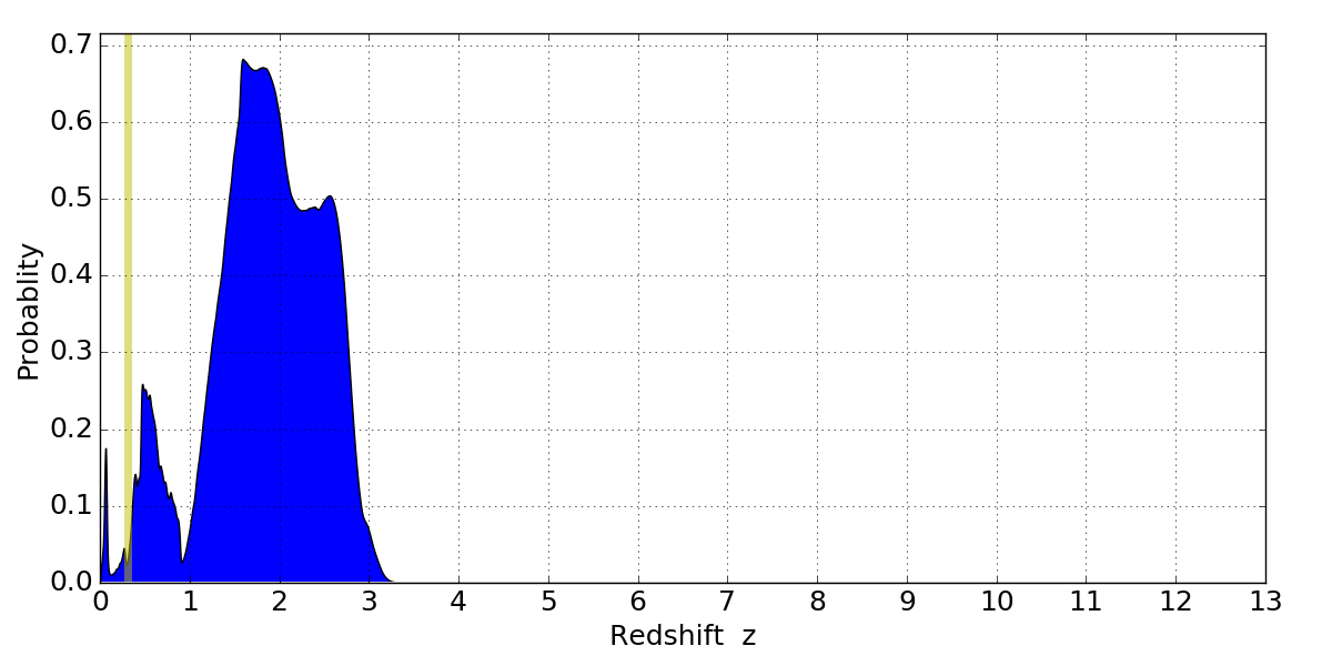 In P(z) plots: Yellow lines mark the cluster redshift z = 0.307,