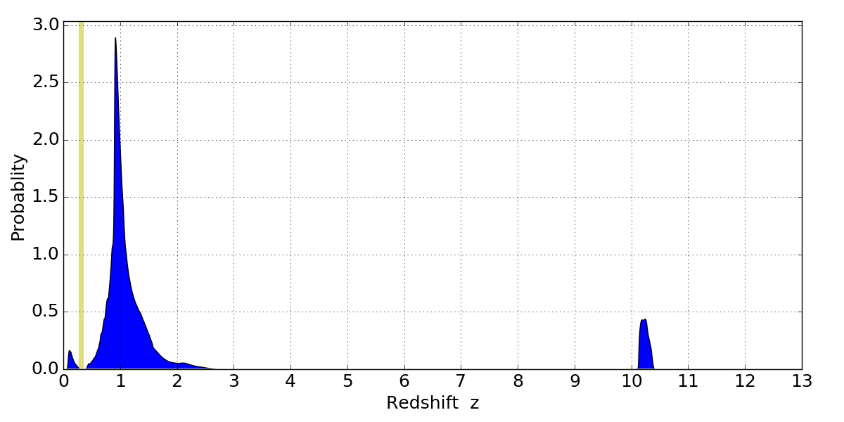 In P(z) plots: Yellow lines mark the cluster redshift z = 0.307,