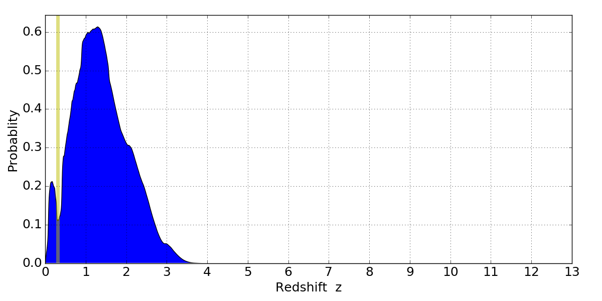 In P(z) plots: Yellow lines mark the cluster redshift z = 0.307,
