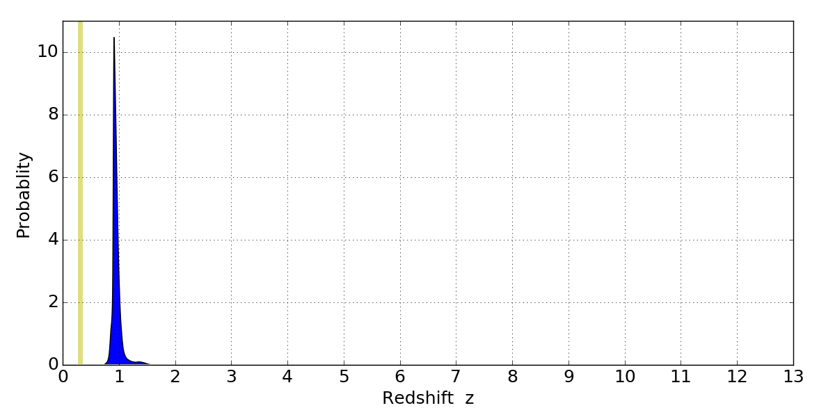In P(z) plots: Yellow lines mark the cluster redshift z = 0.307,