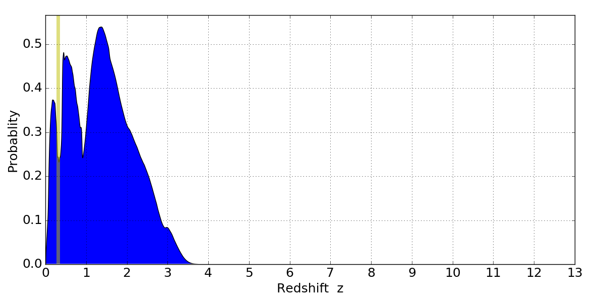 In P(z) plots: Yellow lines mark the cluster redshift z = 0.307,