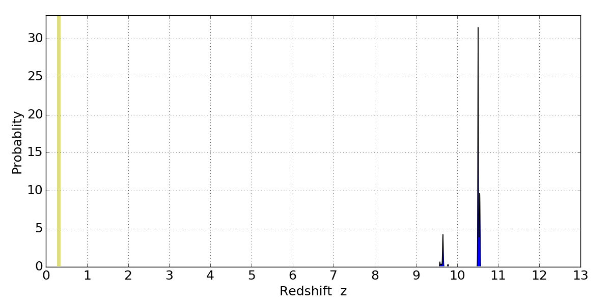 In P(z) plots: Yellow lines mark the cluster redshift z = 0.307,