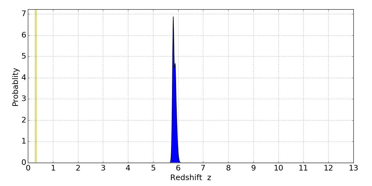 In P(z) plots: Yellow lines mark the cluster redshift z = 0.307,