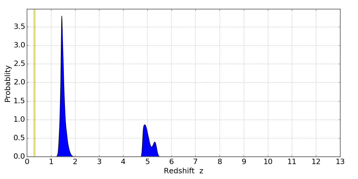 In P(z) plots: Yellow lines mark the cluster redshift z = 0.307,