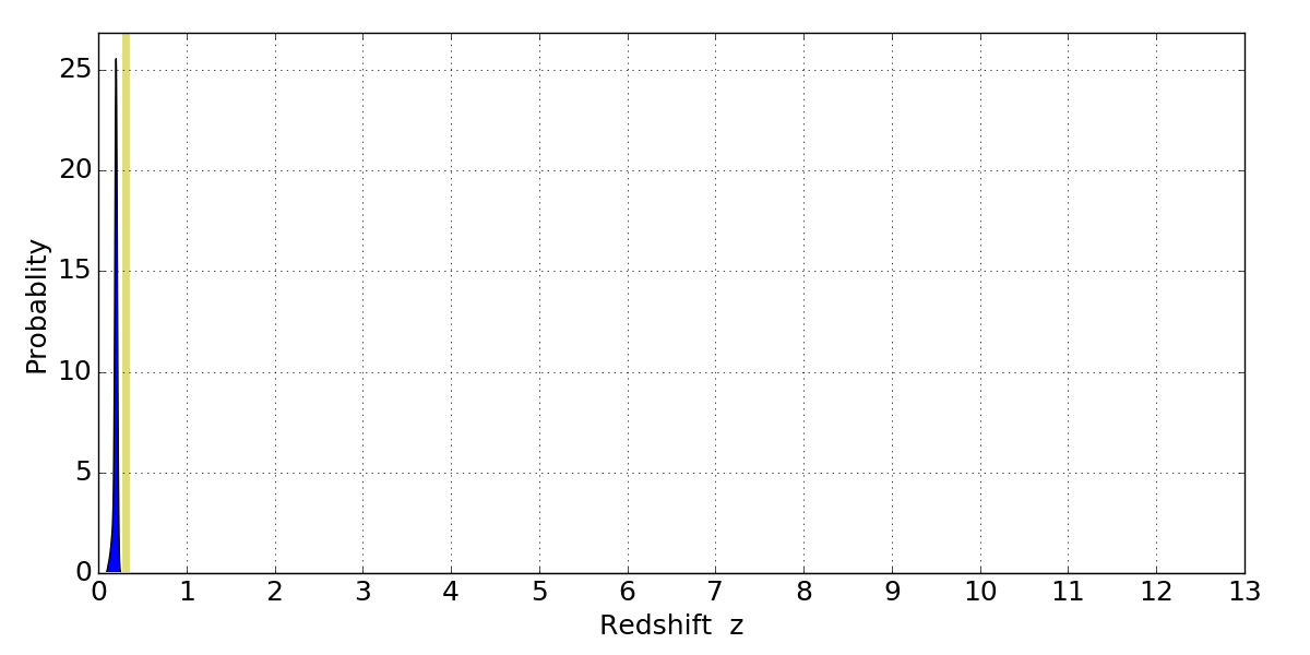 In P(z) plots: Yellow lines mark the cluster redshift z = 0.307,