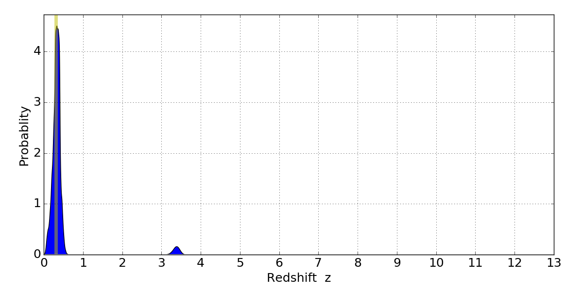 In P(z) plots: Yellow lines mark the cluster redshift z = 0.307,