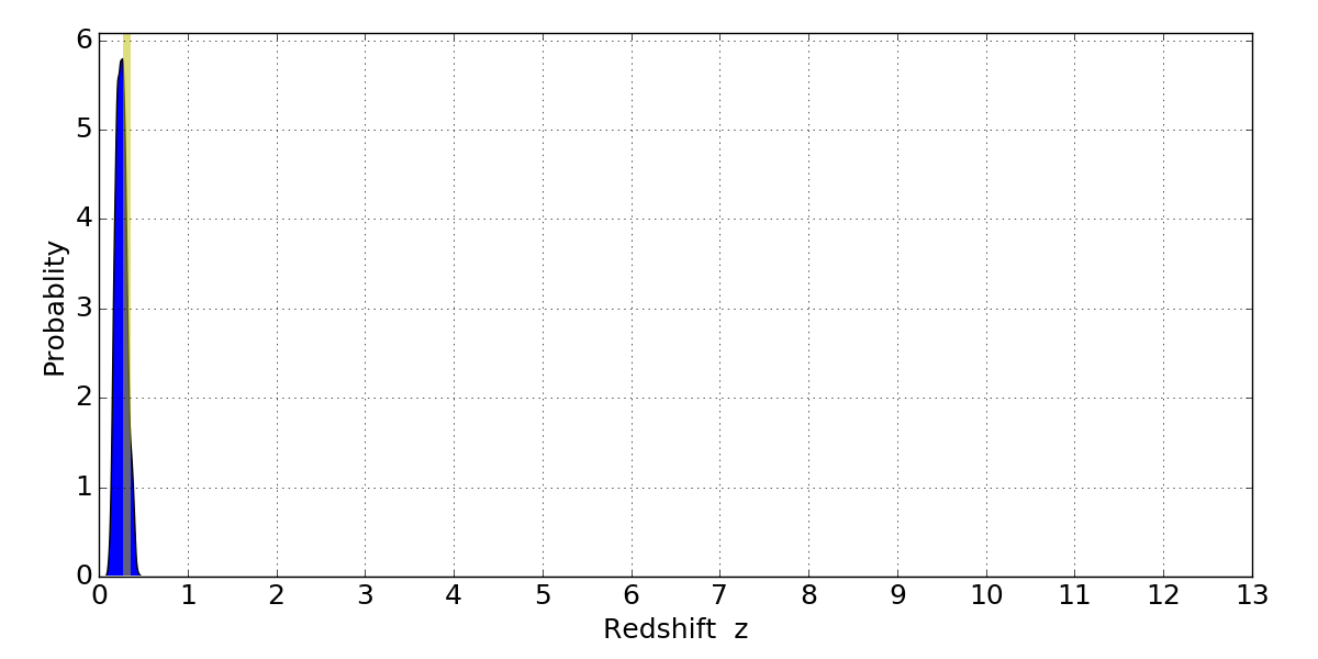 In P(z) plots: Yellow lines mark the cluster redshift z = 0.307,