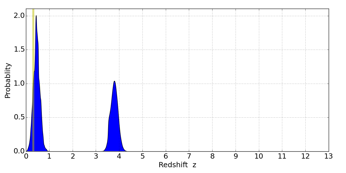 In P(z) plots: Yellow lines mark the cluster redshift z = 0.307,