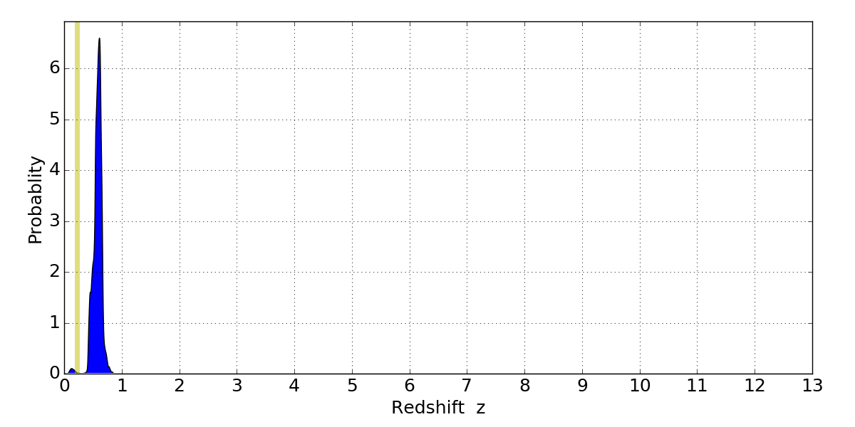 In P(z) plots: Yellow lines mark the cluster redshift z = 0.228,