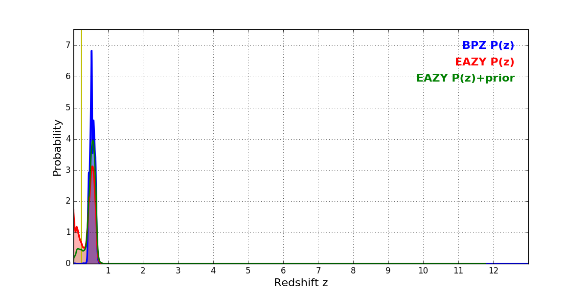 In P(z) plots: Yellow lines mark the cluster redshift z = 0.228,