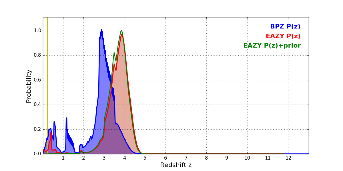 In P(z) plots: Yellow lines mark the cluster redshift z = 0.228,