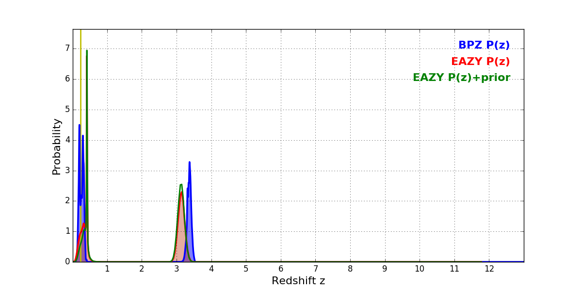 In P(z) plots: Yellow lines mark the cluster redshift z = 0.228,