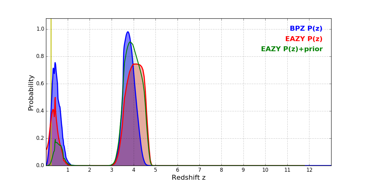 In P(z) plots: Yellow lines mark the cluster redshift z = 0.228,