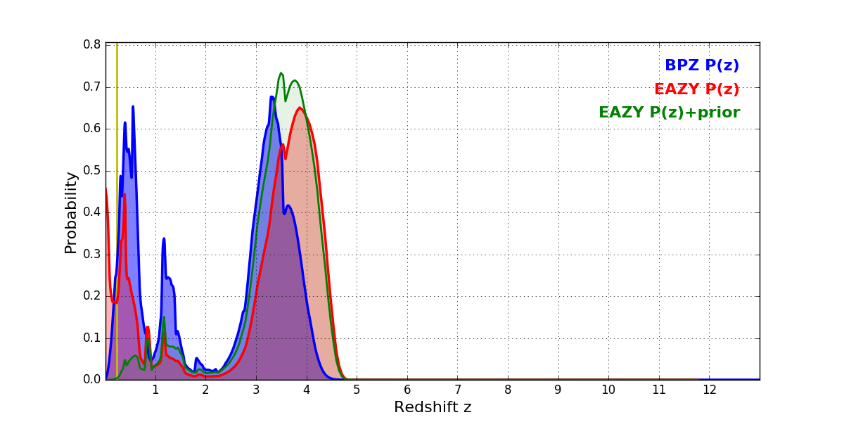 In P(z) plots: Yellow lines mark the cluster redshift z = 0.228,