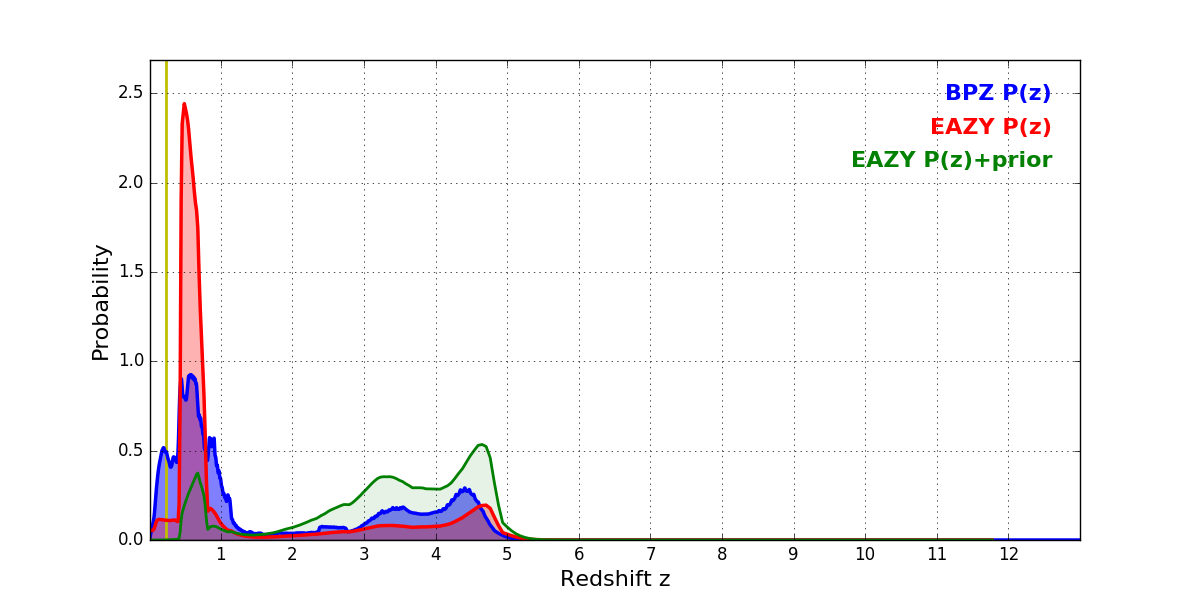 In P(z) plots: Yellow lines mark the cluster redshift z = 0.228,