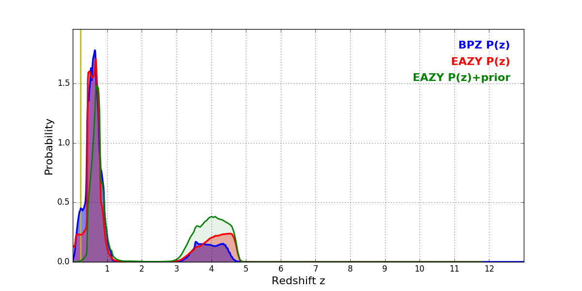 In P(z) plots: Yellow lines mark the cluster redshift z = 0.228,