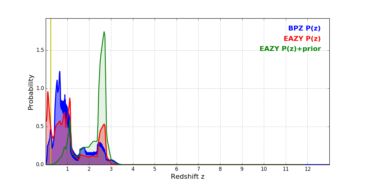 In P(z) plots: Yellow lines mark the cluster redshift z = 0.228,