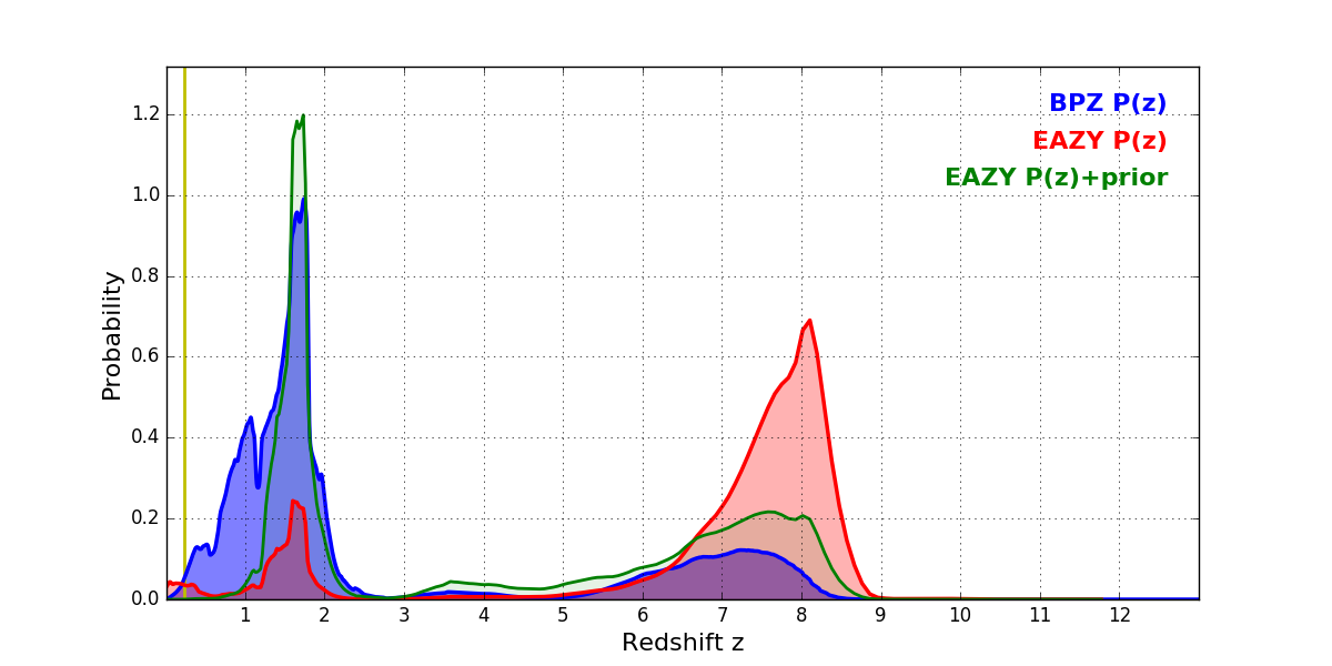 In P(z) plots: Yellow lines mark the cluster redshift z = 0.228,