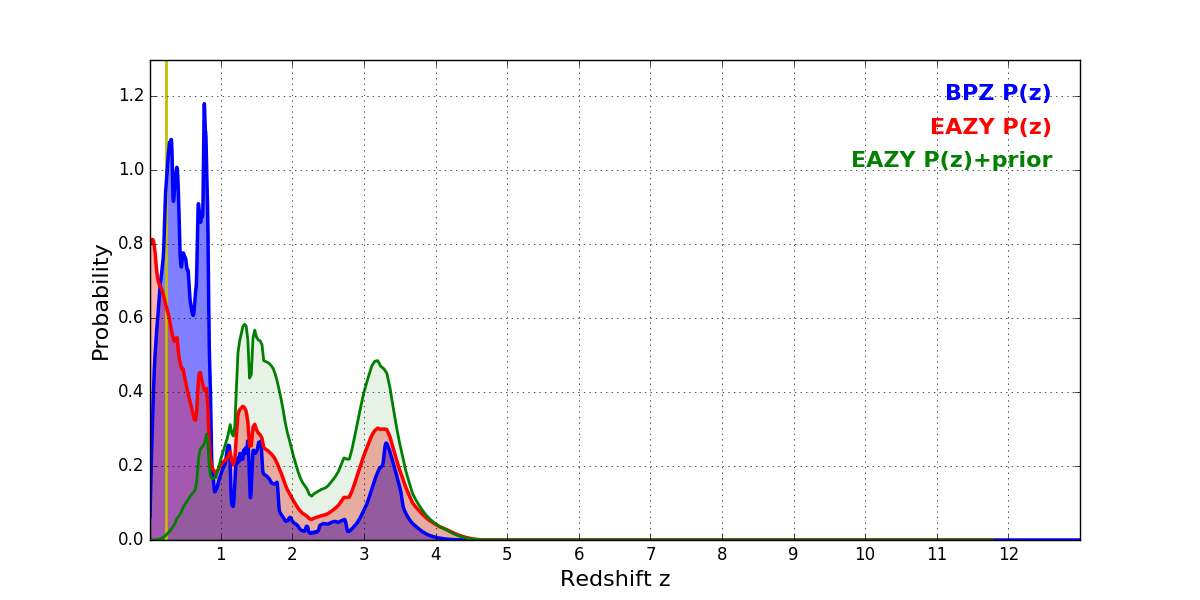 In P(z) plots: Yellow lines mark the cluster redshift z = 0.228,