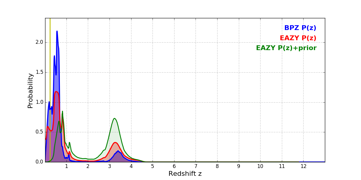 In P(z) plots: Yellow lines mark the cluster redshift z = 0.228,