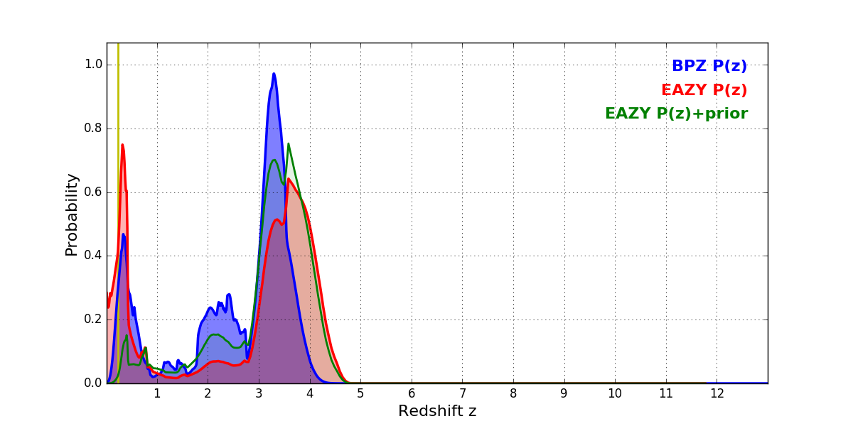 In P(z) plots: Yellow lines mark the cluster redshift z = 0.228,