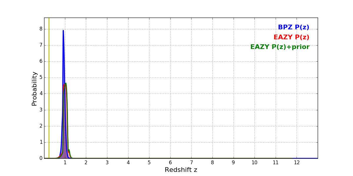 In P(z) plots: Yellow lines mark the cluster redshift z = 0.228,