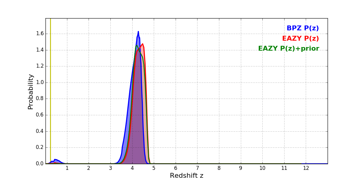 In P(z) plots: Yellow lines mark the cluster redshift z = 0.228,