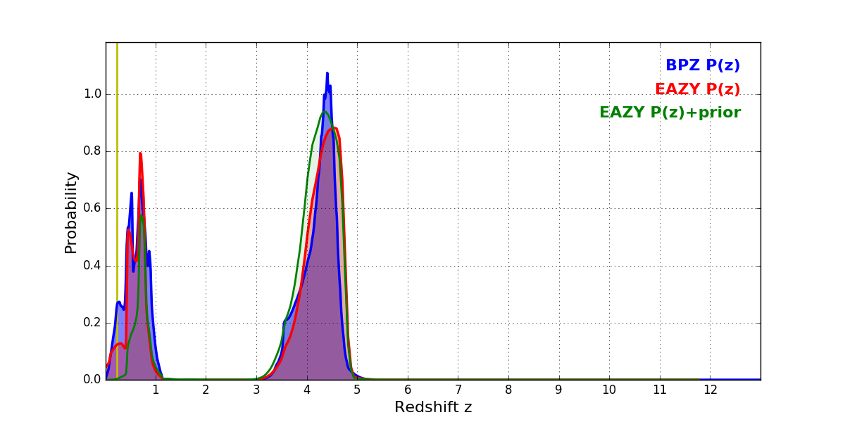 In P(z) plots: Yellow lines mark the cluster redshift z = 0.228,