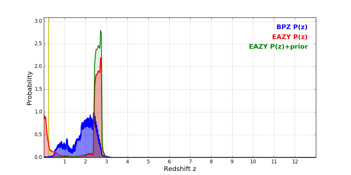 In P(z) plots: Yellow lines mark the cluster redshift z = 0.228,