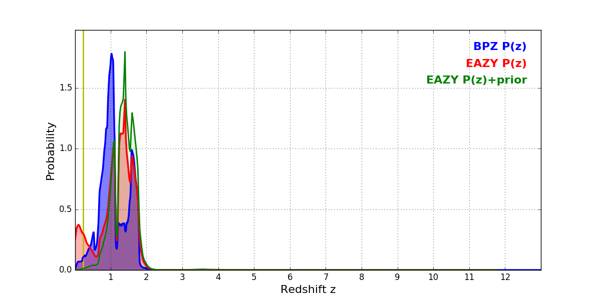 In P(z) plots: Yellow lines mark the cluster redshift z = 0.228,