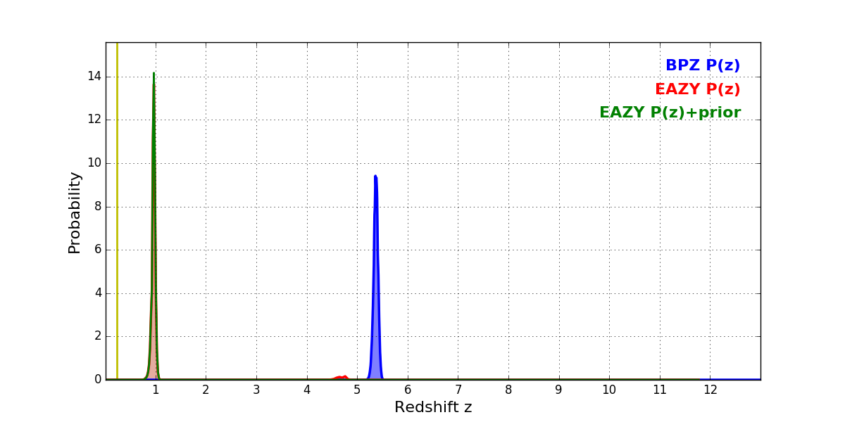 In P(z) plots: Yellow lines mark the cluster redshift z = 0.228,
