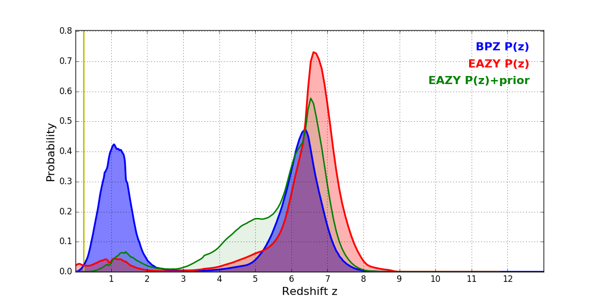 In P(z) plots: Yellow lines mark the cluster redshift z = 0.228,