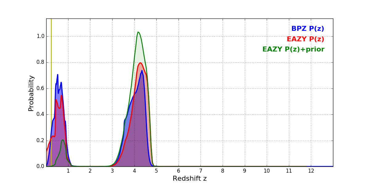 In P(z) plots: Yellow lines mark the cluster redshift z = 0.228,